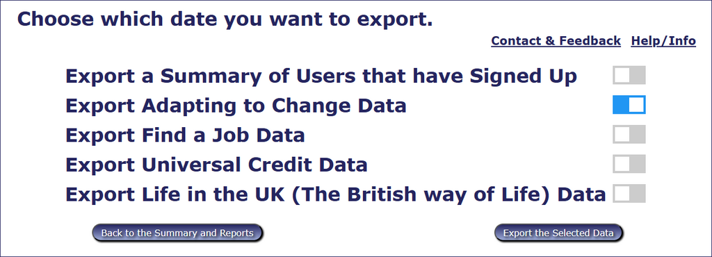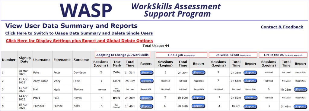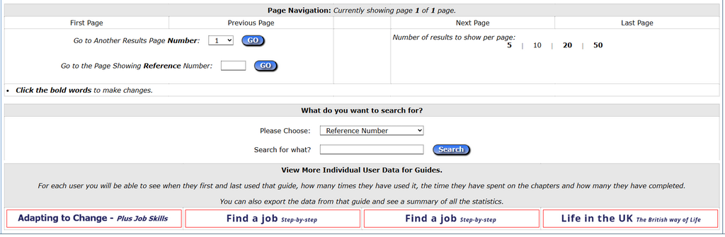 The first page of data that you see when you log in is the User Data Summary and reports. This section provides a comprehensive overview of users' progress through the guides (the number of times they have logged in and total time spent reading them), together with the assessment mark (Adapting to Change, Employment Skills only).
