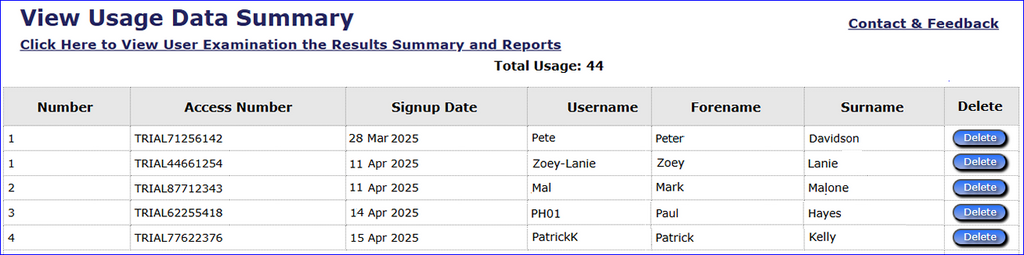 The usage summary shows how the system is being utilized. It includes information about the number of active users, when they signed up, and their full name and username. This data helps administrators quickly assess the usage of the system without all the other data that is on the User Data Summary and Reports screen.