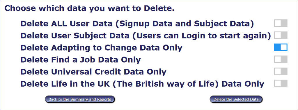 On the screen, there are also buttons allowing the administrator to delete all the data for an individual user. These buttons take you to a screen where you can choose whether to delete all the data or just parts.