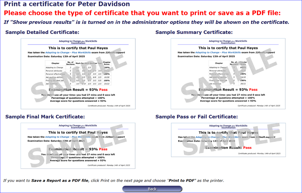 By default, the user cannot print their own certificate. This is so that the administrator can discuss the results with the user as the certificate is handed over. However, this can be changed and a button automaticaly added to the exit page allowing one of the four variations of the certificate available.