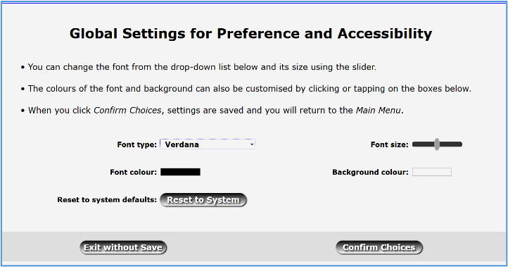 When you click the Preferences or Accessibility button you will see the screen below. The colours etc. are the current System Settings which you can change as you wish. The screen will change to reflect your choices and this will become the default style that the user will see when they login. They can, however, change it to suit their own preferences.