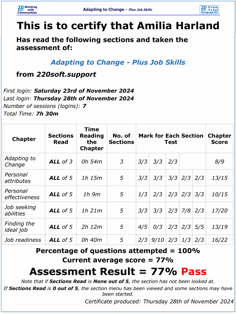 The Employment Support Collection allows for remote or face-to-face support for people and can assess their knowledge of work skills prior to using the products and again on completion. This allows for distance travelled to be established.