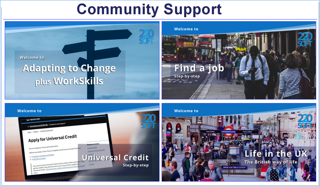 The Community Support collection gives support in job hunting and the government's online Find a job process. To help those wanting to know more about and claim Universal Credit there is a step by step guide for users to follow.